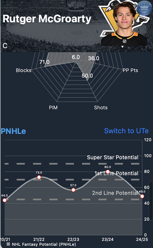As you can see by his pNHLe, the scoring potential may have dipped last season, but there is still significant scoring potential as recently as the 2023-24 season. Longer term, Pittsburgh’s rebuild will eventually inject higher-end skill into the lineup, but McGroarty’s leadership and intangibles should keep him firmly entrenched near the top of the roster. He profiles as a “heart-and-soul” winger whose role will always be elevated by his ability to complement more dynamic scorers.