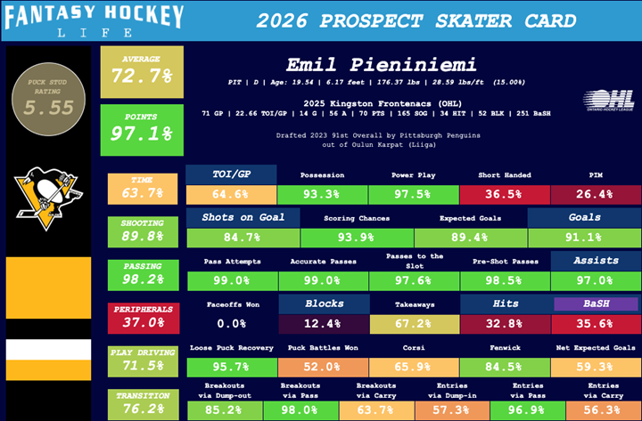 Pieniniemi isn’t going to be confused for an offensive dynamo at the NHL level just yet, but his two-way profile is quietly useful. He plays a responsible game, moves the puck cleanly out of his zone, and has shown steady growth in his transition play. What’s impressed scouts recently, though, is his offensive pop, both in the OHL and at the World Junior Championships, where many expected Aron Kiviharju to be the standout but Pieniniemi stole attention. His Fantasy Hockey Life player card demonstrates his excellent shooting and passing numbers in the OHL, while his play-driving and transition numbers also show promise.