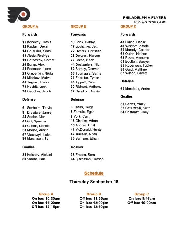 Thursday marked the beginning of the 2025 Flyers training camp. If you’re looking for a reminder of the schedule and camp roster, check out our story with all of the 2025 Flyers Training Camp information!