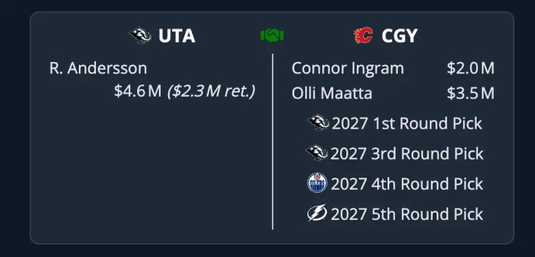 Based on the Utah Mammoth’s timeline, it seems like there isn’t time to wait for that to happen. On the other hand, the Flames also don’t need to take on the entirety of 31-year-old defenceman Olli Maatta’s contract. Bringing on a 31-year-old left-shot defenceman for three years when you already have a logjam makes no sense. The draft capital is nice, but the trade, as a whole, makes no sense for the Flames.Â