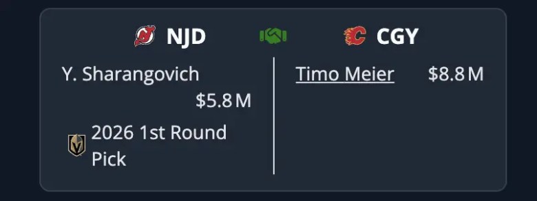 I see the New Jersey Devils fans’ vision, but I am not really interested. The Flames could certainly use a 25+ goal scorer, but are in no business giving up a first-round pick right now. Timo Meier is 28 years old in year three of his eight-year deal. I’m not entirely sure the Flames need to be involved in that. They should be doing everything in their power to avoid that, actually.Â