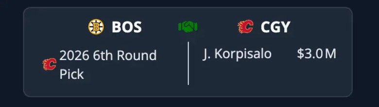 Similar to the first trade, the Flames really aren’t in the market for another goaltender. Joonas Korpisalo does not want a backup role. He wants to play more than 20–25 games a season. That just isn’t likely to happen in a world where Dustin Wolf is your starter.Â