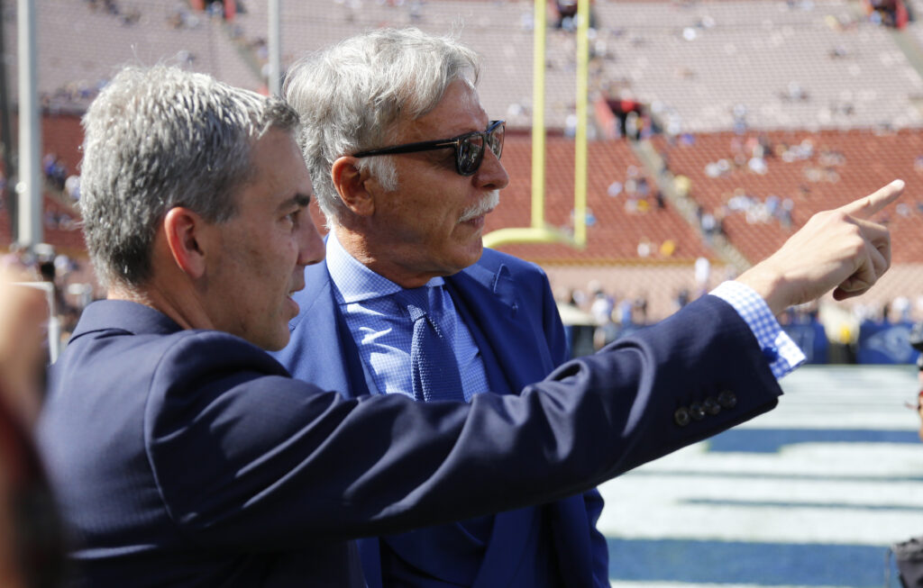 Los Angeles Rams owner Stan Kroenke, right, and Kevin Demoff, Rams COO and executive vice president of football operations, look around Los Angeles Memorial Coliseum before a preseason NFL football game between the Rams and the Dallas Cowboys, Saturday, Aug. 13, 2016, in Los Angles. (AP Photo/Ryan Kang)