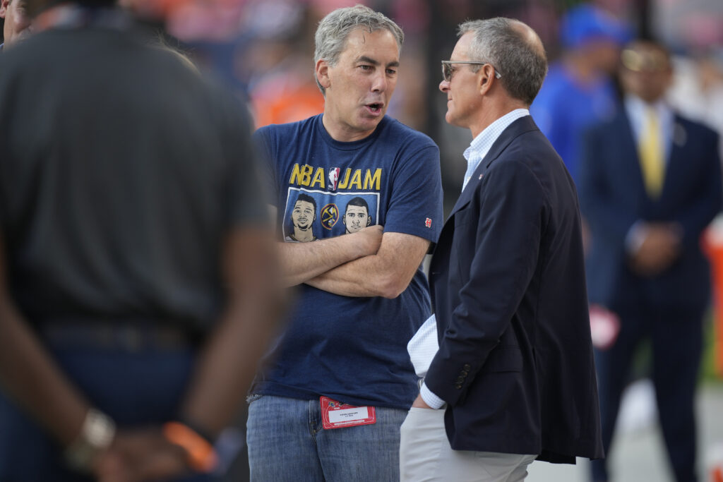 Los Angeles Rams’ Kevin Demoff, left, chats with Denver Broncos president Greg Penner before an NFL preseason football game Saturday, Aug. 26, 2023, in Denver. (AP Photo/David Zalubowski)