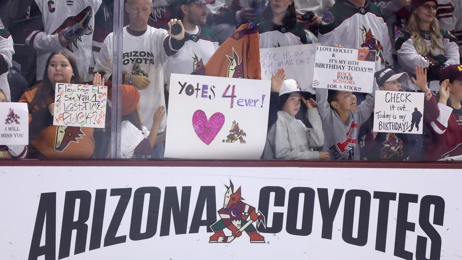 TEMPE, ARIZONA – APRIL 17: Fans hold up signs before the NHL game between the Edmonton Oilers and the Arizona Coyotes at Mullett Arena on April 17, 2024 in Tempe, Arizona. (Photo by Christian Petersen/Getty Images)