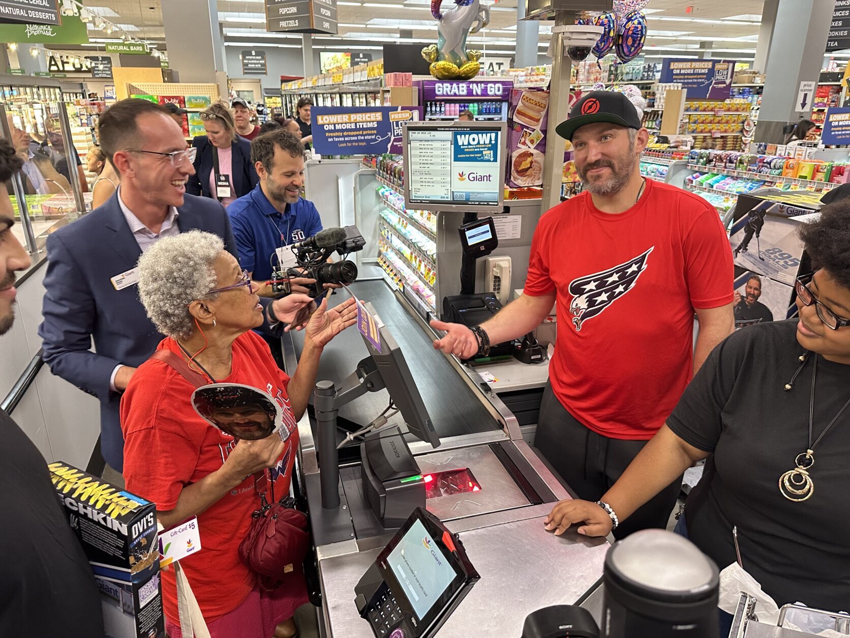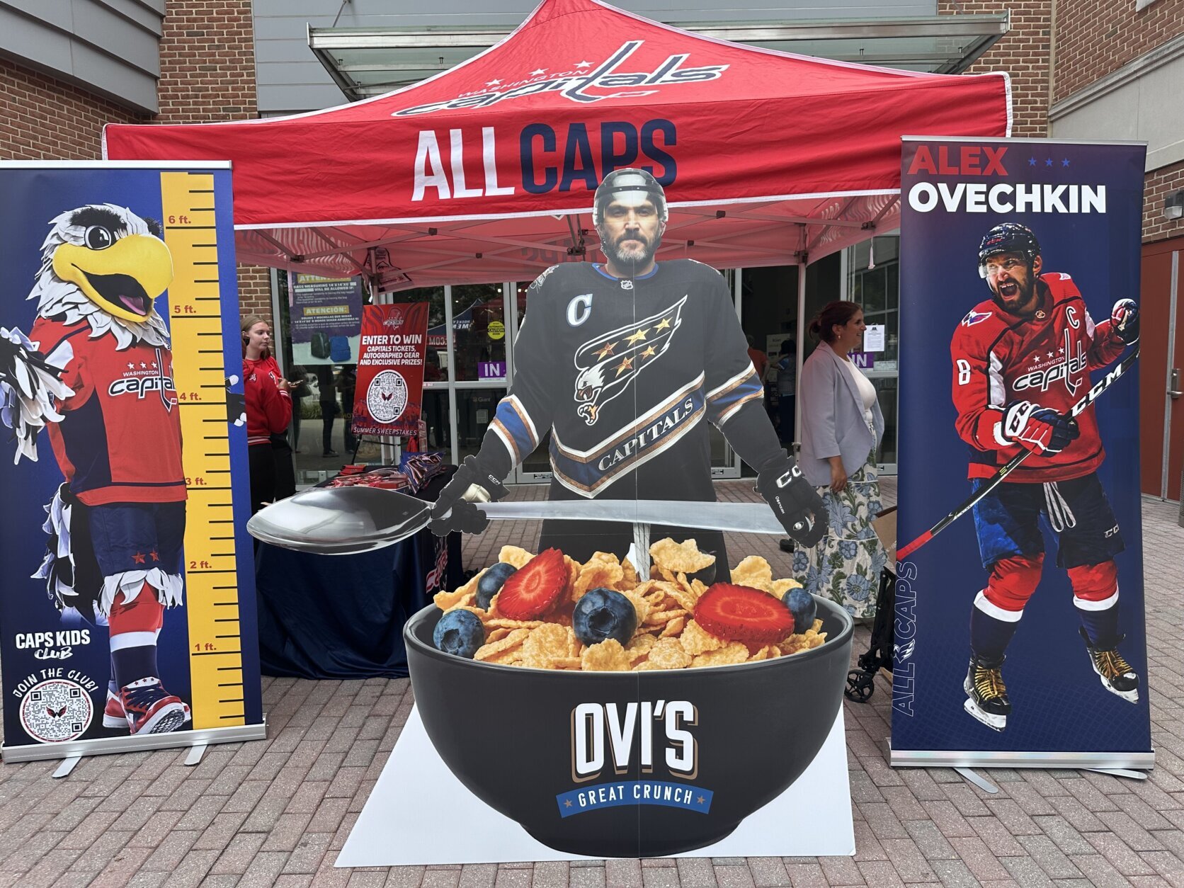 The NHL’s all-time goals leader surprised grocery shoppers on Tuesday at a Giant Food store on Wisconsin Avenue in Northwest D.C. Ovechkin handed out boxes of cereal, worked the checkout line and poured the milk at a cereal bar. He also joined a group of kids trying their first bowls of Ovi’s Great Crunch.