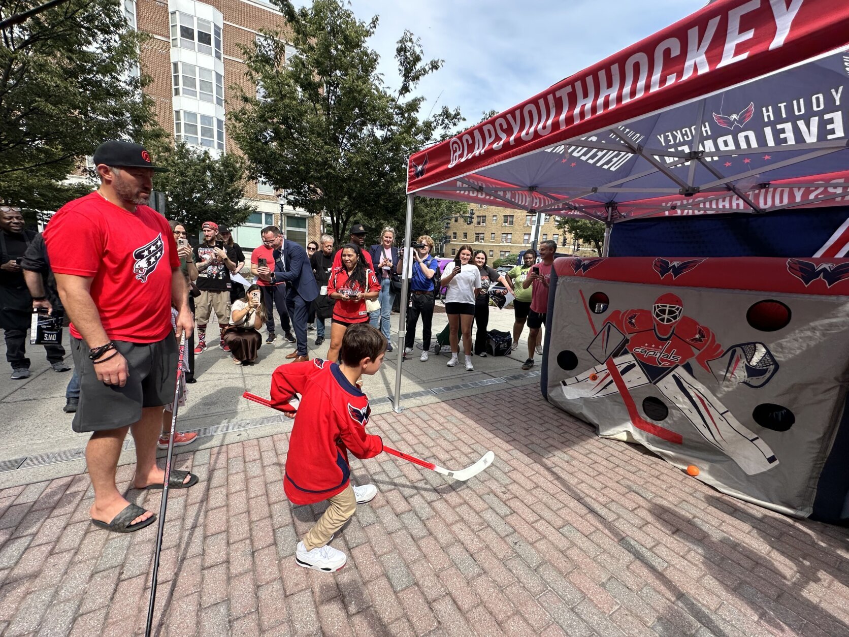 A young fan shoots a puck outside the Giant Food in the D.C. neighborhood of Cathedral Heights.