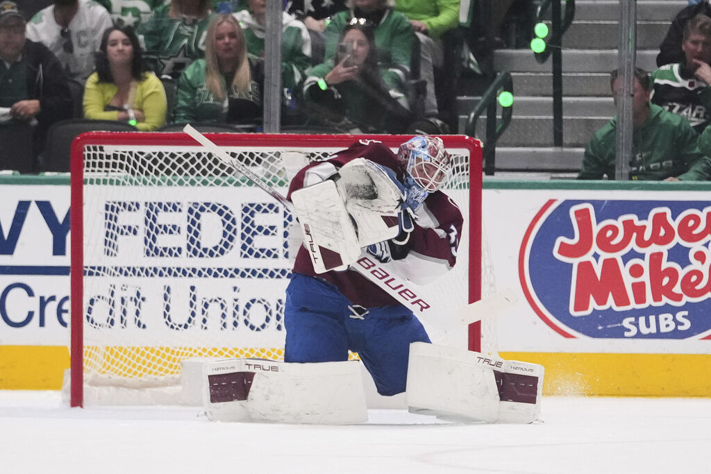 Colorado Avalanche goaltender Mackenzie Blackwood makes a save in the second period in Game 7 of a first-round NHL hockey playoff series against the Dallas Stars Saturday, May 3, 2025, in Dallas. (AP Photo/Julio Cortez)