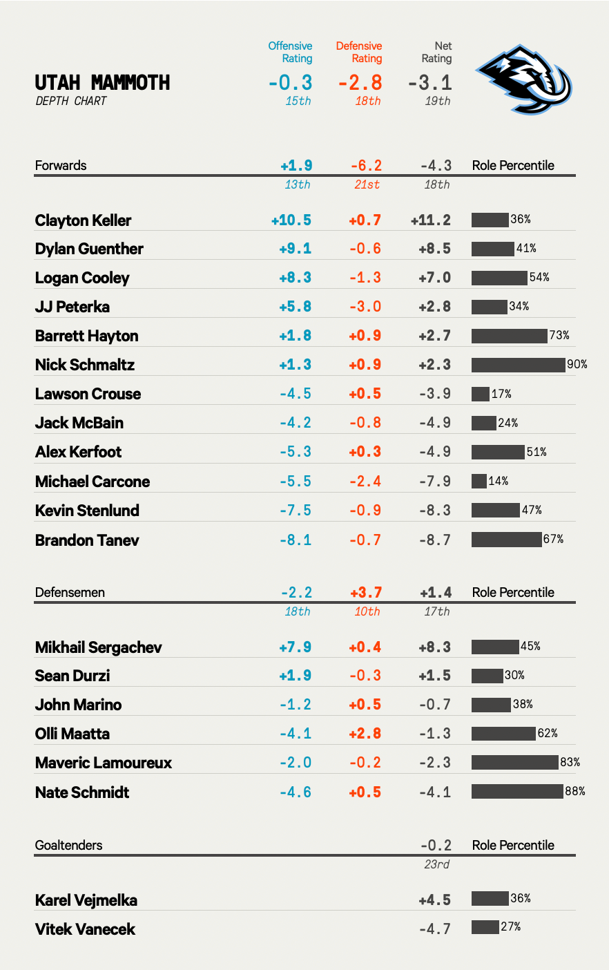 Ideally, a team has at least three reliable scoring lines. Utah, as it stands, has two. And what this group lacks offensively isn’t made up for defensively. That would help cancel out some of the weaknesses in the top six, like Peterka’s team-worst minus-three Defensive Rating; that brings the forward group down to 21st in the league and opens up another potential vulnerability.