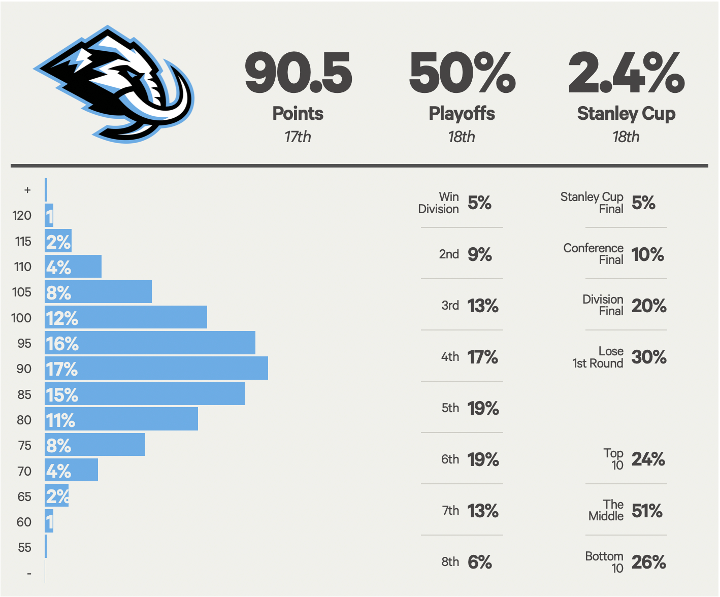 If there’s any projection that makes us most nervous, it’s this one. It’s hard not to see Utah’s explosive potential as a future powerhouse, especially after a sizable rise in the team’s underlying numbers despite key injuries on the back end. But a 90-point forecast actually positions the Mammoth lower than last season. What gives?