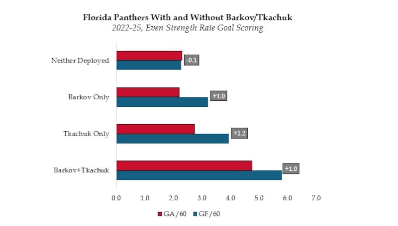 One of the ways you can tease this out is by looking at how the Panthers performed in those thousands of minutes when Barkov and Tkachuk were either unavailable (owing to injuries) or on the bench. Over the past three seasons, Florida’s played nearly 7,000 minutes with Barkov and Tkachuk away from the ice. The results speak for themselves: