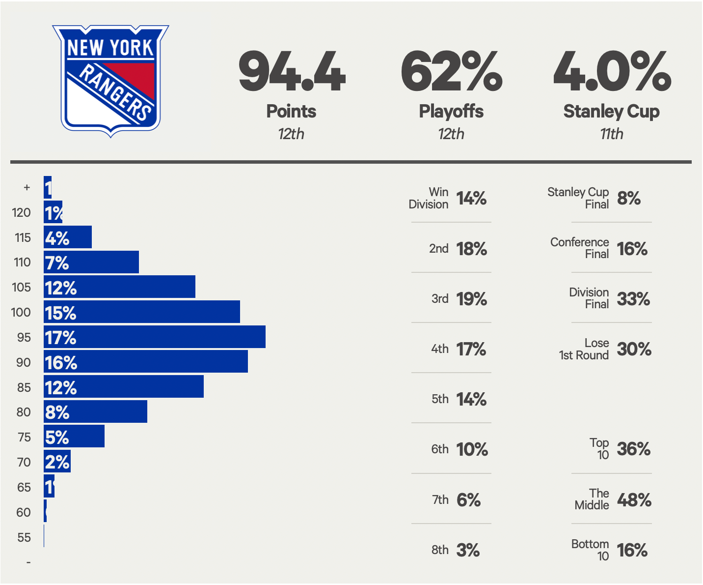 Whether New York pulls that feat off is questionable, with a one-in-three chance of advancing past the first round and an equal shot at being a 100-plus point team. After last season’s misery, contending is far from a given.