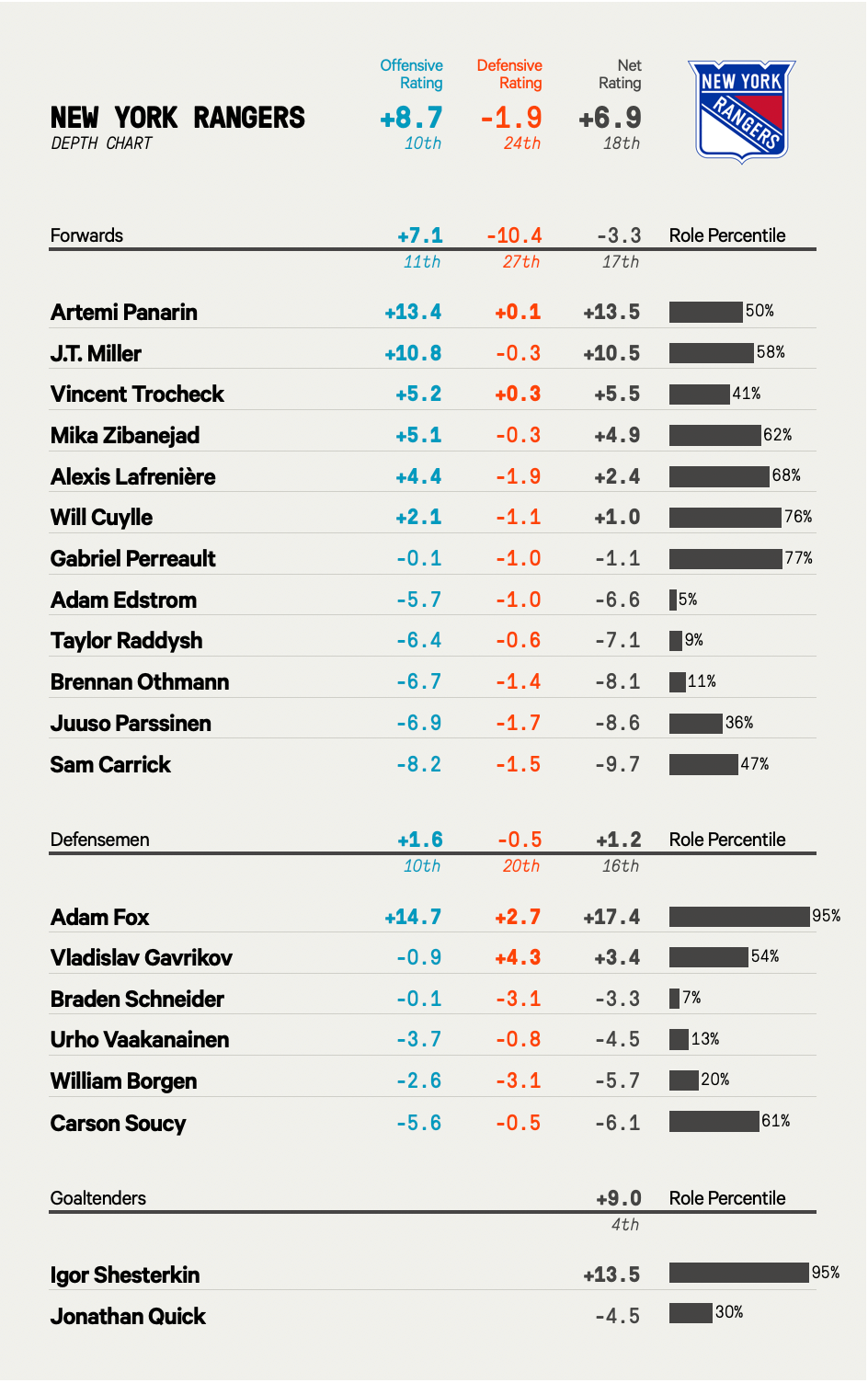If Will Cuylle can build on his last year, he should round out the top six. He was one of the few sparks in a miserable season, between his puck battles, physicality and much-needed secondary scoring. He is one of six forwards with a positive Offensive Rating on the Rangers, which helps move the needle up to 10th in the league.