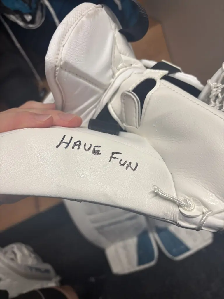 Nedeljkovic told SHD that he personally writes these messages on his pads rather than having them designed. The San Jose Sharks goalie says it means more that he wrote it, rather than it just appearing. Nedeljkovic says the glove and blocker are the most common places due to the easy ability to take a quick look in between plays.