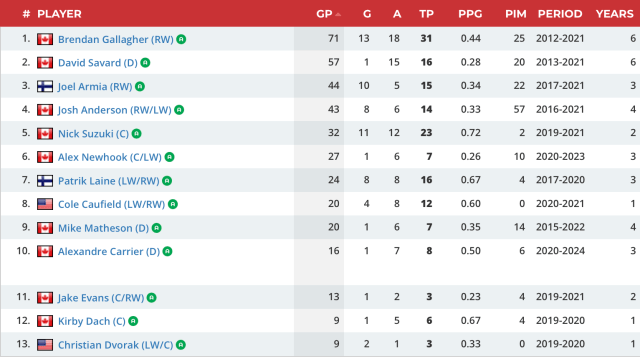 Montreal Canadiens NHL playoff experience (source: Elite Prospects)