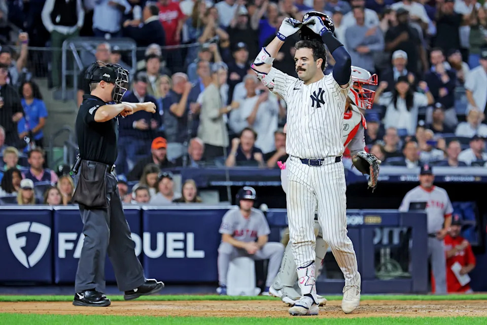 Anthony Volpe reacts after hitting a solo home run during the first inning of Game 1 against the Red Sox.