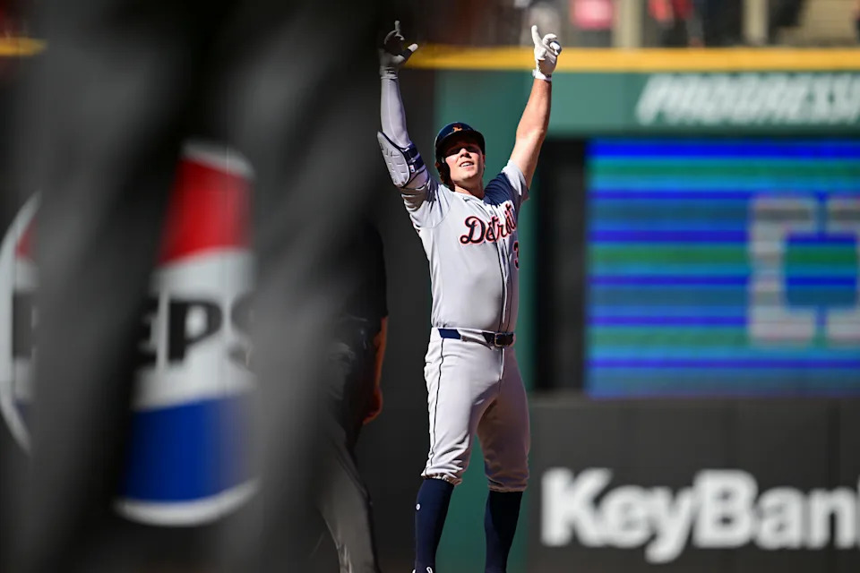 Tigers outfielder Kerry Carpenter celebrates after hitting a double in Game 1 against the Guardians.