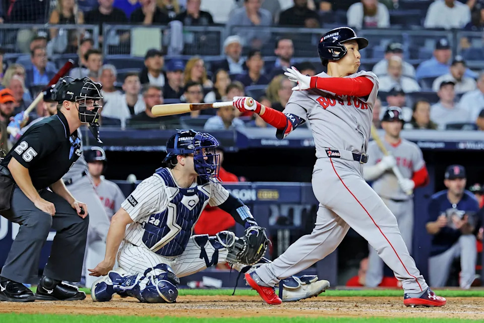 Masataka Yoshida hits a two-run single during the seventh inning against the Yankees during Game 1.