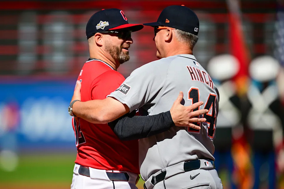 Guardians manager Stephen Vogt hugs Tigers skipper A.J. Hinch before Game 1 at Progressive Field.