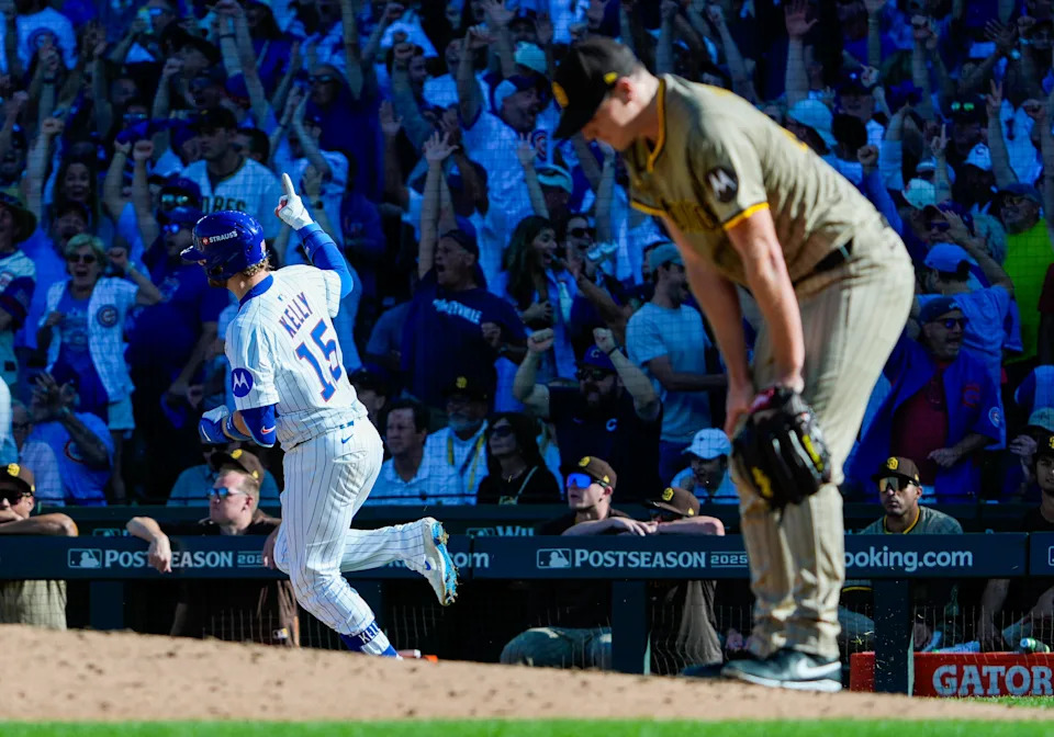 Cubs catcher Carson Kelly rounds the bases after hitting a solo home run in the fifth inning of Game 1.