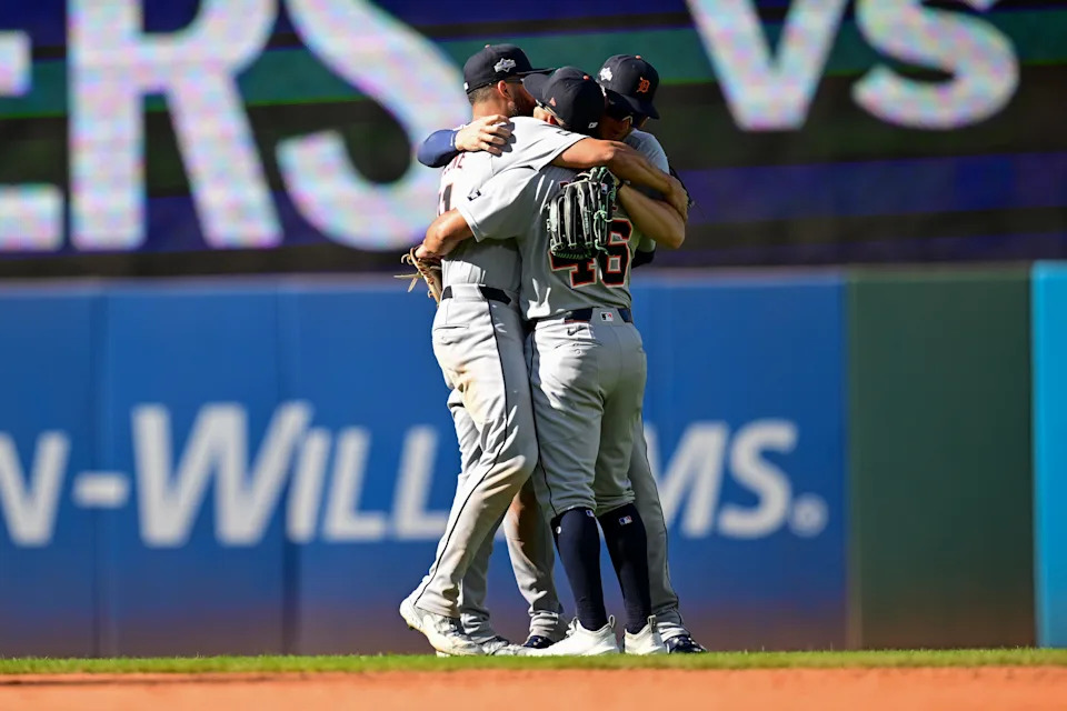 Tigers pitcher Tarik Skubal is congratulated by Javier Báez before being relieved in the eighth inning of Game 1 against the Guardians.