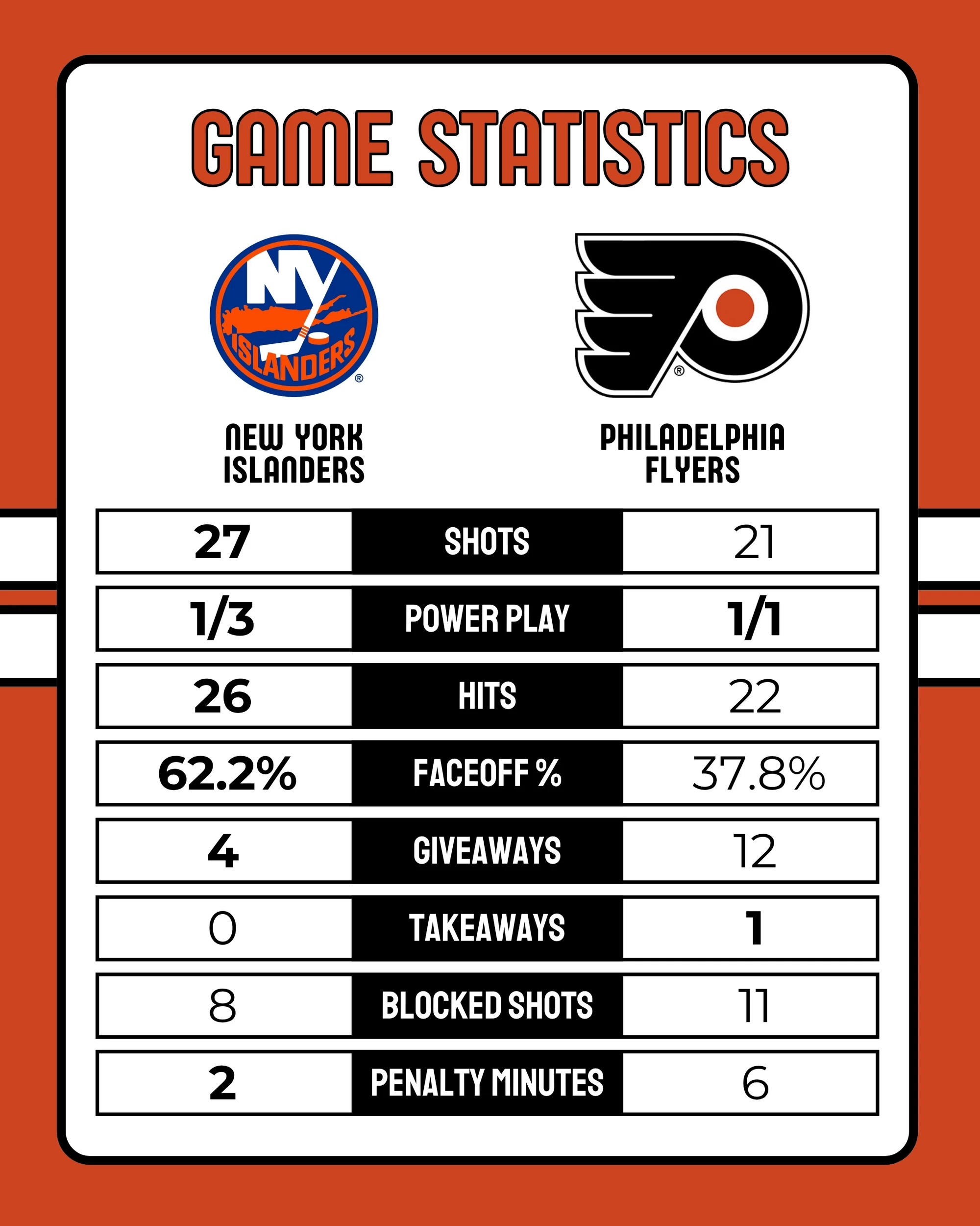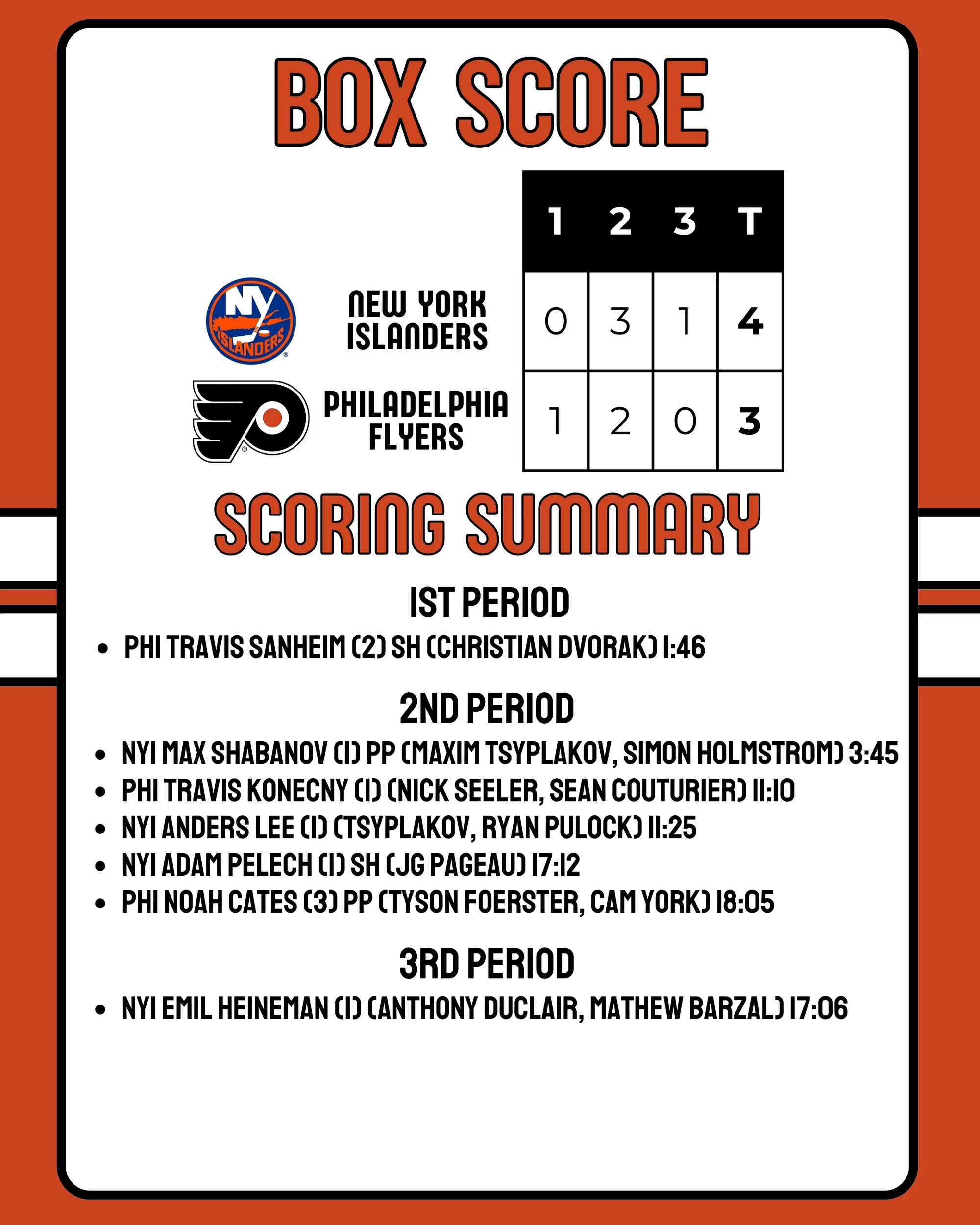 The Islanders took the lead with a shorthanded goal of their own at 17:12. A turnover by Matvei Michkov at the offensive blue line allowed an eventual 2-on-0. JG Pageau fed Adam Pelech for the goal to make it 3-2.