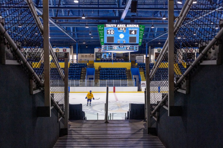 The Taffy Abel Arena on the campus of Lake Superior State University in Sault Sainte Marie, Michigan, was renamed for the hockey great in 1993 after renovations. Here, a member of the university team gets in some practice on Sept. 29, 2025. Credit: Charles Fox for ICT
