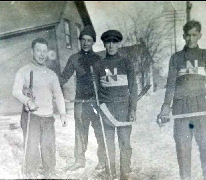 Hall of Fame hockey player Clarence “Taffy” Abel, second from left, is shown here at age 15 with friends, from left, Wally Graith, Sam Kokko and Vic Desjardins in 1915. The group played regularly in a rink in the Kokko backyard in Sault Ste. Marie, Michigan. The “N” on the jersey shows they are fans of their hometown “Nationals” hockey team. Credit: Photo courtesy of the Jones Family Collection