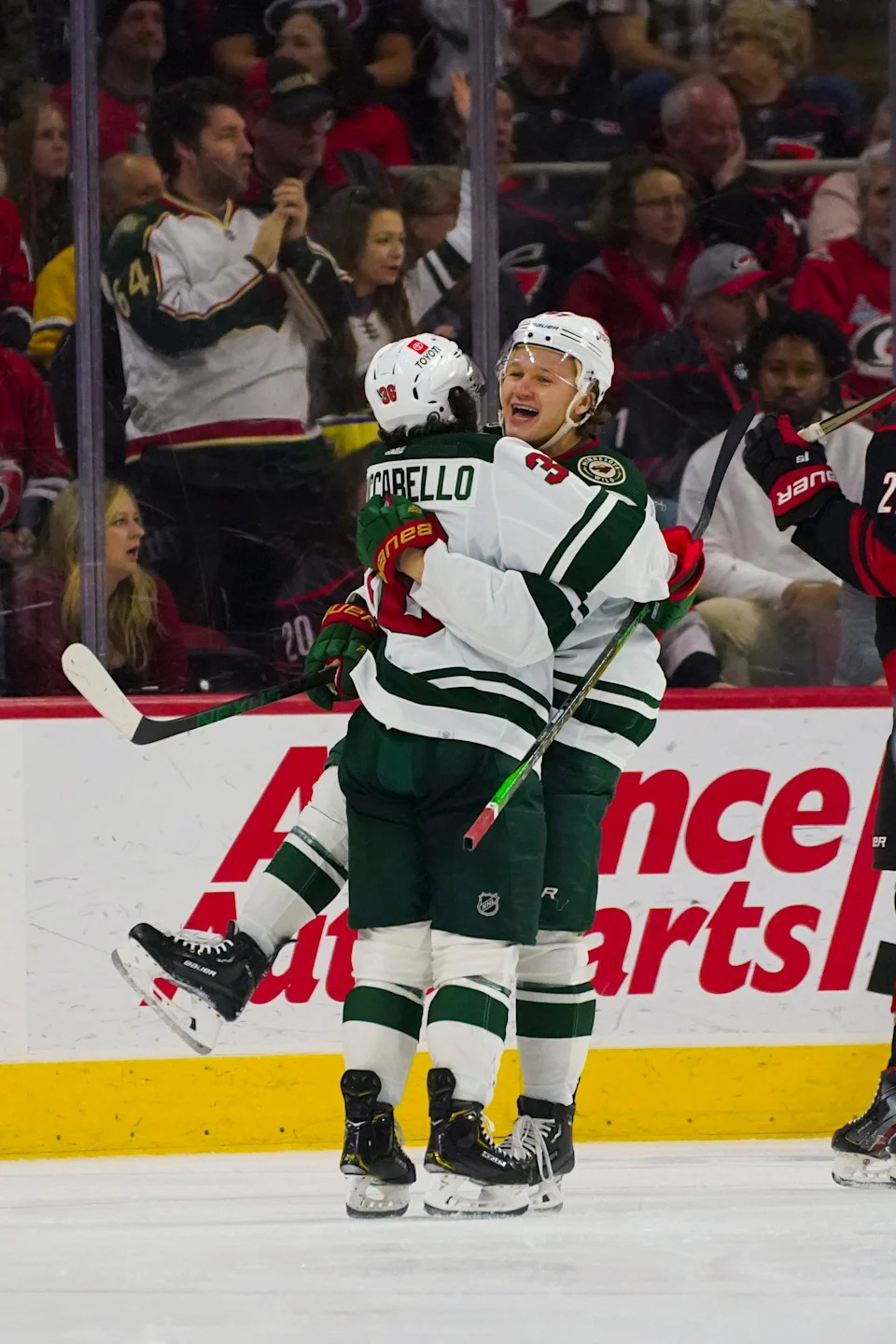 Minnesota Wild left wing Kirill Kaprizov is congratulated by right wing Mats Zuccarello after his goal against the Carolina Hurricanes during the third period at PNC Arena in Raleigh, North Carolina, on April 2, 2022.