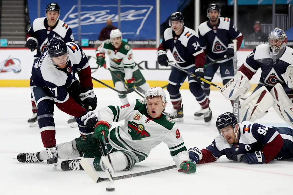 J.T. Compher and Gabriel Landeskog of the Colorado Avalanche fight for the puck against Kirill Kaprizov of the Minnesota Wild in the first period at Ball Arena on Feb. 2, 2021, in Denver.
