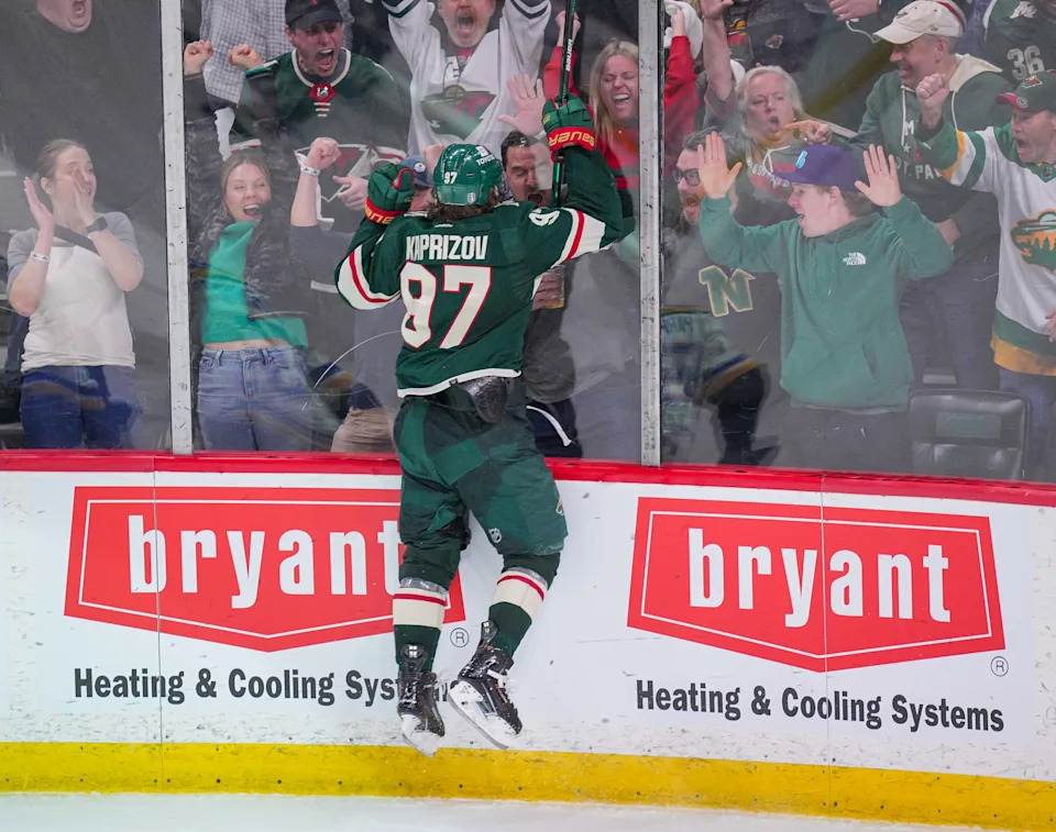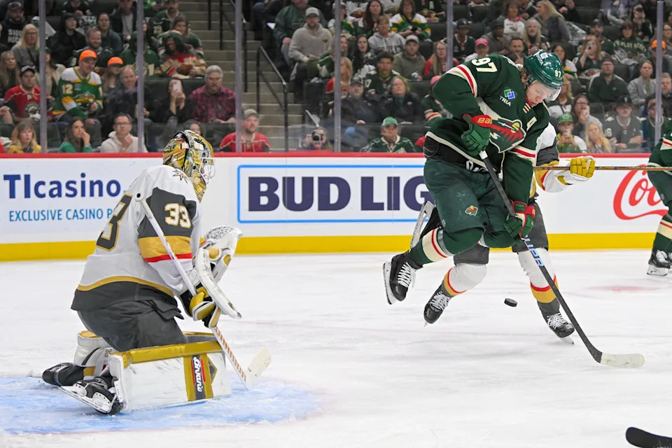 Minnesota Wild forward Kirill Kaprizov jumps as he deflects a puck towards Vegas Golden Knights goalie Adin Hill during Game 6 of the first round of the 2025 Stanley Cup Playoffs at Xcel Energy Center in Saint Paul, Minnesota on May 1, 2025.