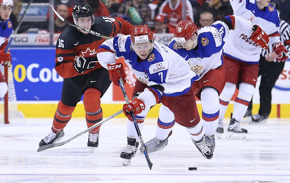 Kirill Kaprizov of Team Russia skates with the puck against Team Canada during a game at the 2017 IIHF World Junior Hockey Championships at the Air Canada Centre on Dec. 26, 2016, in Toronto.