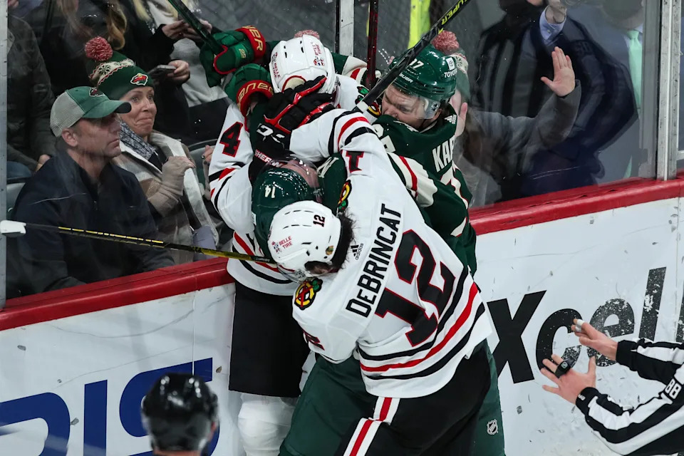 Chicago Blackhawks defenseman Seth Jones and left wing Alex DeBrincat get into a scrum with Minnesota Wild center Joel Eriksson Ek and left wing Kirill Kaprizov during overtime at Xcel Energy Center in Saint Paul, Minnesota, on Jan. 22, 2022.