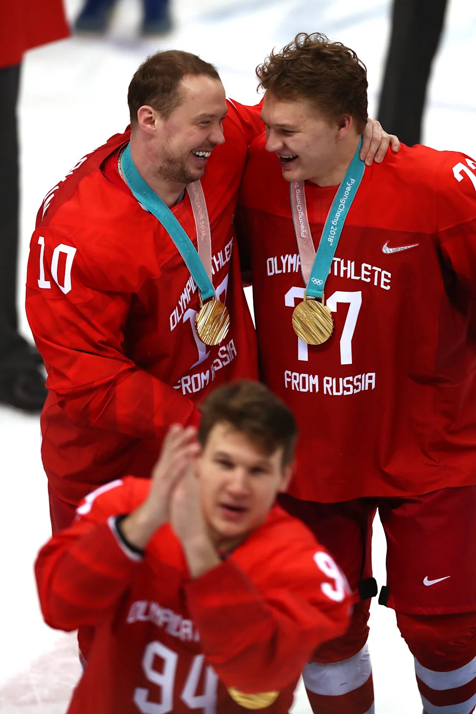 Gold medal winners Sergei Mozyakin and Kirill Kaprizov of the Olympic Athletes from Russia celebrate after defeating Germany 4-3 in overtime during the men’s ice hockey championship in the 2018 Winter Olympics at Gangneung Hockey Centre on Feb. 25, 2018, in South Korea.