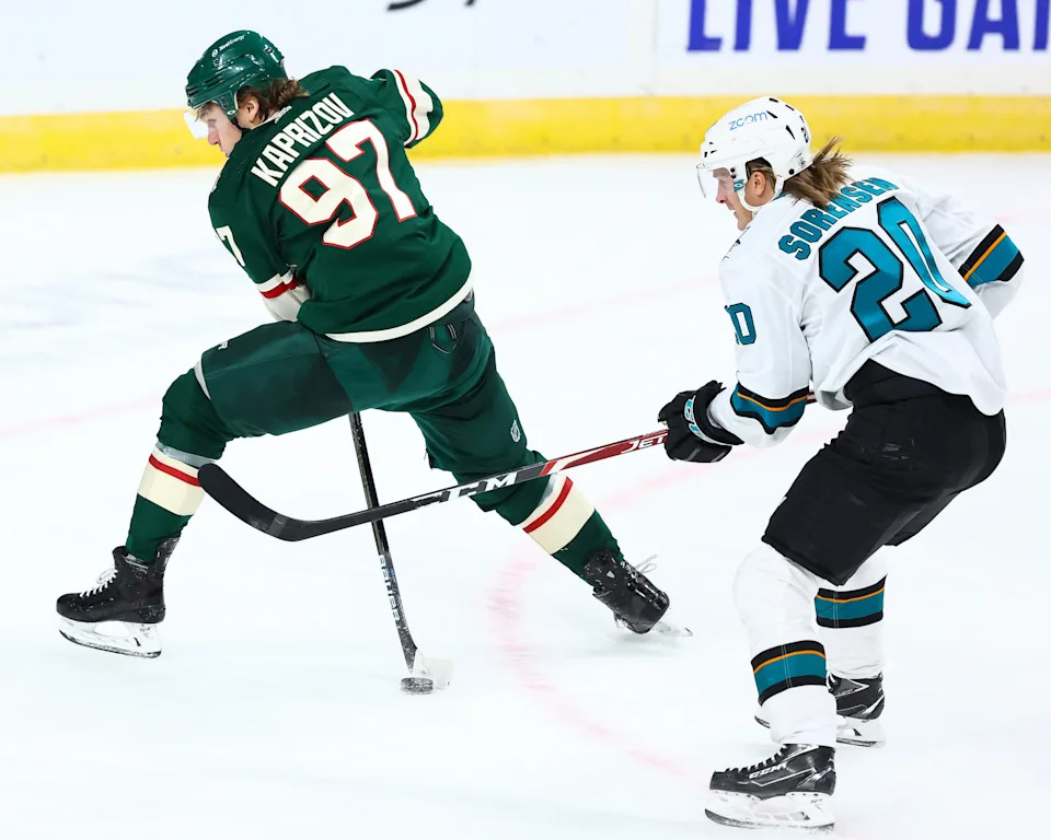 Kirill Kaprizov of the Minnesota Wild attempts to pass the puck as Marcus Sorensen of the San Jose Sharks defends him during the third period at Xcel Energy Center on Jan. 22, 2021, in St. Paul, Minnesota.
