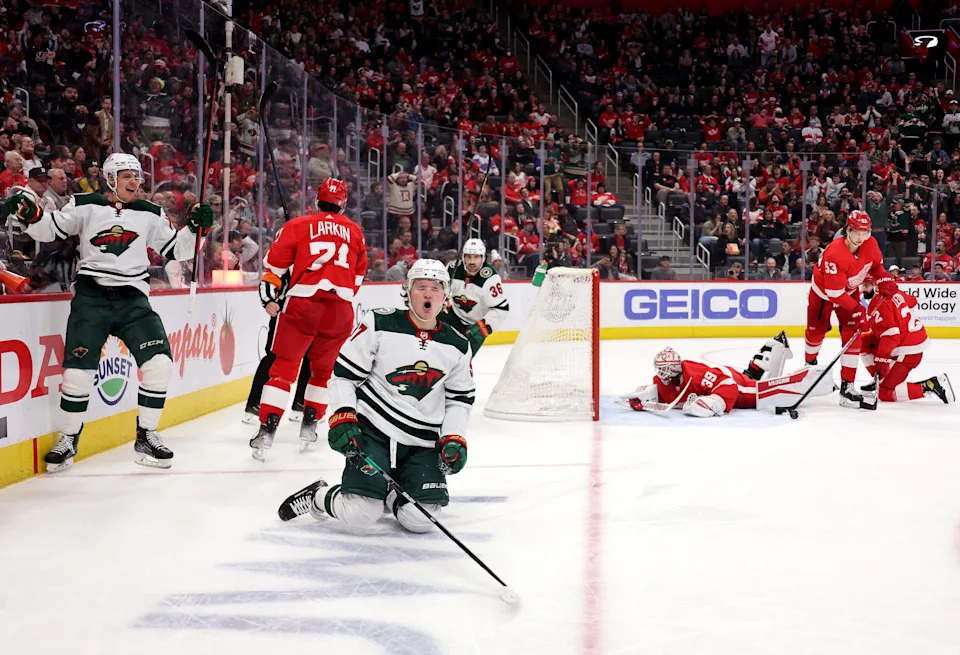 Kirill Kaprizov of the Minnesota Wild celebrates his third-period goal against the Detroit Red Wings at Little Caesars Arena on March 10, 2022, in Detroit.