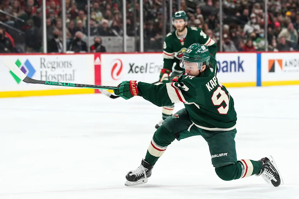Minnesota Wild left wing Kirill Kaprizov looks on during the third period against the Carolina Hurricanes at Xcel Energy Center in Saint Paul, Minnesota, on Feb. 12, 2022.