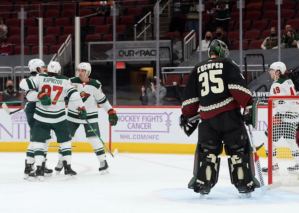 Minnesota Wild left wing Kirill Kaprizov celebrates his goal against Arizona Coyotes goaltender Darcy Kuemper during the first period at Gila River Arena in Glendale, Arizona, on April 19, 2021. Kaprizov scored his first career hat trick in the game.