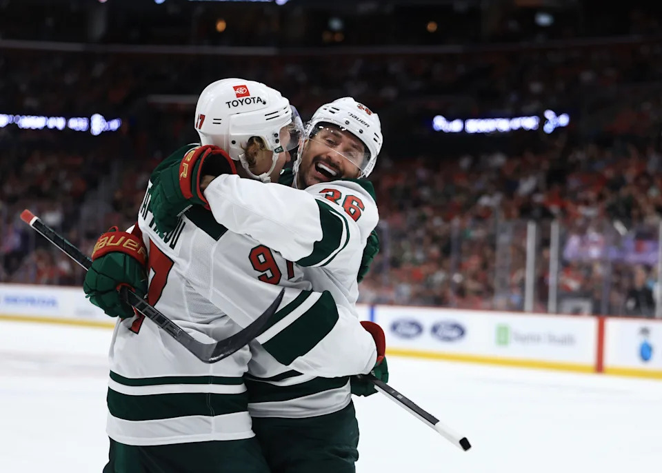 Mats Zuccarello of the Minnesota Wild celebrates his goal with Kirill Kaprizov during the second period against the Florida Panthers at Amerant Bank Arena on Oct. 22, 2024, in Sunrise, Florida.