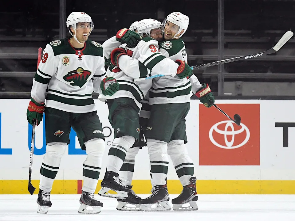 Kirill Kaprizov of the Minnesota Wild celebrates his game-winning goal with Nick Bonino and Victor Rask during a 4-3 overtime win over the Los Angeles Kings in the season opener at Staples Center on Jan. 14, 2021, in Los Angeles. It was Kaprizov’s first goal in the NHL.