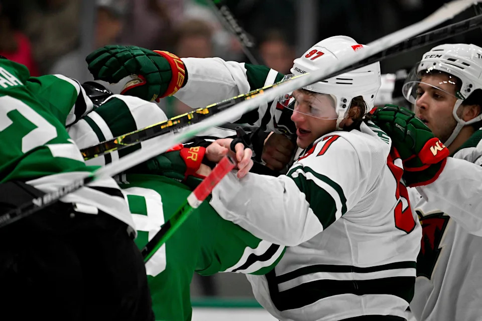 Dallas Stars center Max Domi fights with Minnesota Wild left wing Kirill Kaprizov during the third period in Game 2 of the first round of the 2023 Stanley Cup Playoffs at American Airlines Center in Dallas on April 19, 2023.