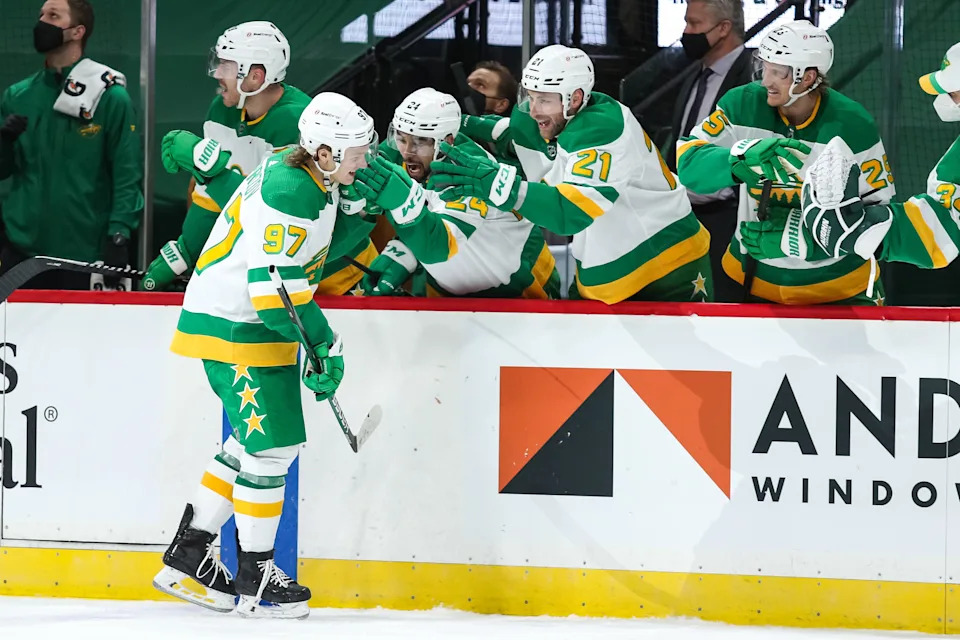 Minnesota Wild left wing Kirill Kaprizov celebrates with teammates after scoring a goal against the Arizona Coyotes in the third period at Xcel Energy Center in Saint Paul, Minnesota, on March 12, 2021.