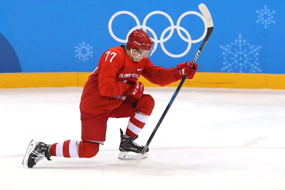 Olympic Athlete from Russia Kirill Kaprizov celebrates after scoring a hat trick against Slovenia in the third period during the men’s ice hockey group round game at Gangneung Hockey Centre on Feb. 16, 2018, in Gangneung, South Korea.
