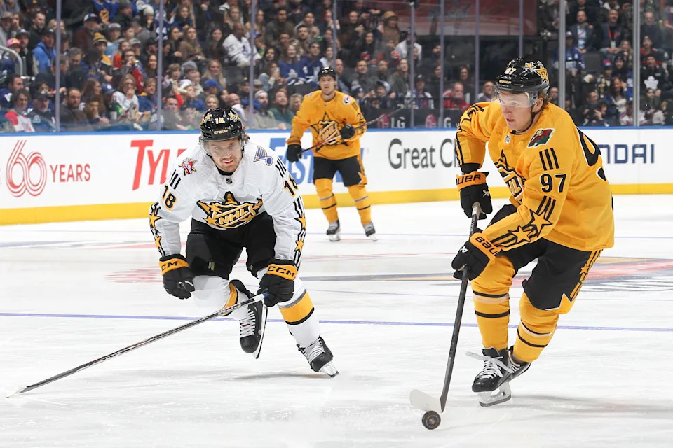 Kirill Kaprizov of the Minnesota Wild skates with the puck against Robert Thomas of the St. Louis Blues during the game between Team MacKinnon and Team McDavid during the 2024 NHL All-Star Game on Feb. 3, 2024, in Toronto.