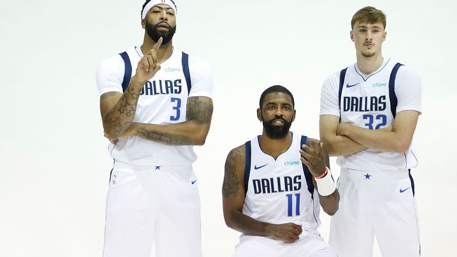 DALLAS, TEXAS – SEPTEMBER 29: Dallas Mavericks players Anthony Davis #3, Kyrie Irving #11 and Cooper Flagg #32 stand for a photo during Dallas Mavericks media day at American Airlines Center on September 29, 2025 in Dallas, Texas. NOTE TO USER: User
