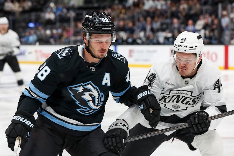 Utah Mammoth defenseman Mikhail Sergachev (98) and Los Angeles Kings defenseman Mikey Anderson (44) battle for position during preseason game at the Delta Center in Salt Lake City on Thursday, Oct. 2, 2025. | Rio Giancarlo, Deseret News