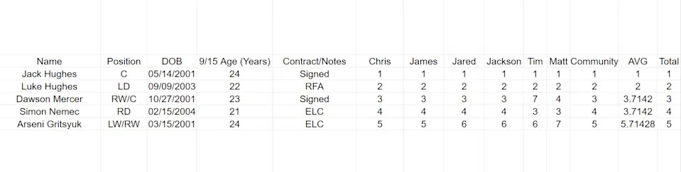 3. Dawson Mercer (RW/C) — Last Rank: 3 — Age: 24 — 2024-25 Team: New Jersey Devils (82 games)