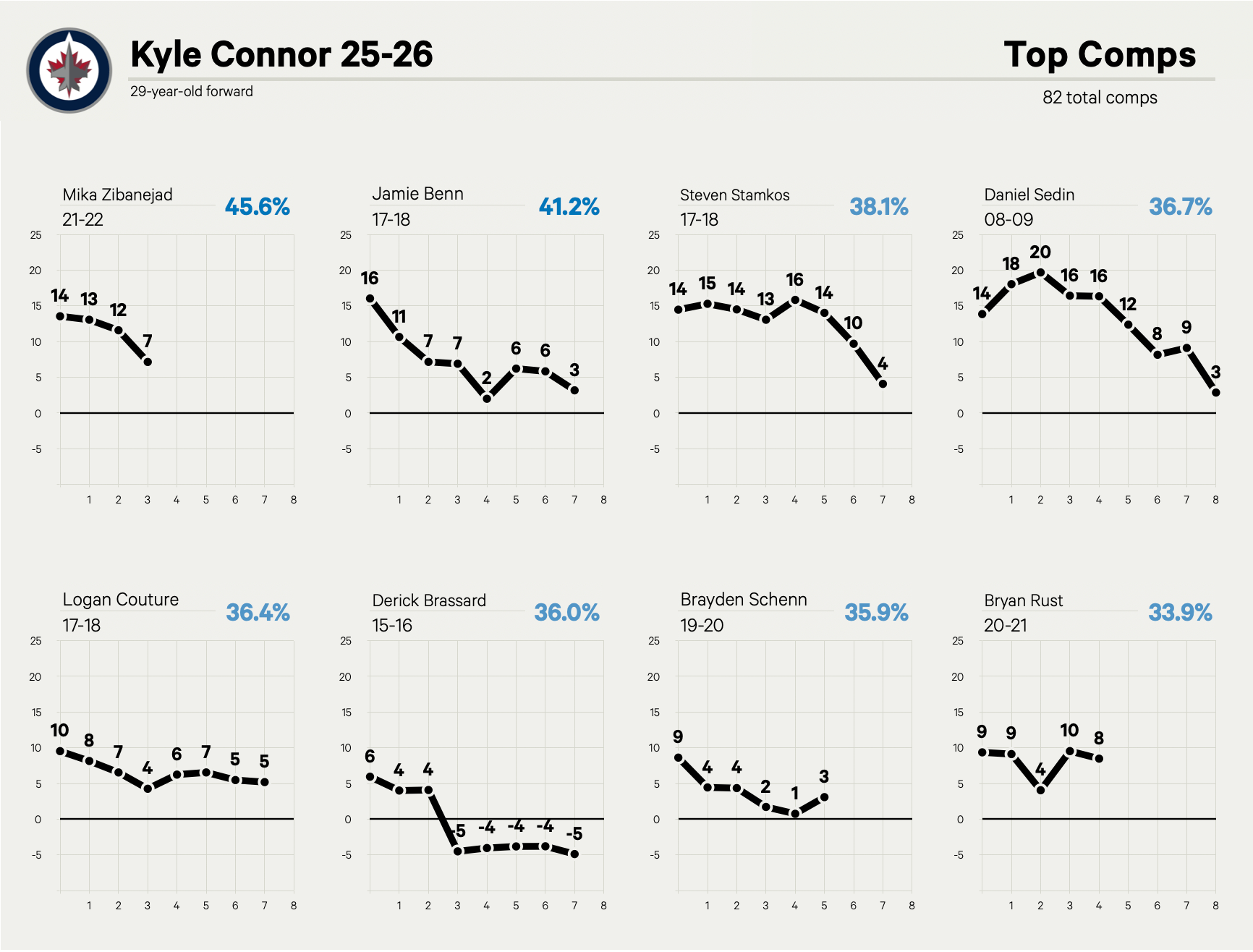 There seem to be a few influencing contracts for Connor’s $12 million AAV. The obvious are the two star wingers of the 2025 class, Rantanen and Marner, who signed matching contracts a couple of months ago. Connor isn’t in the same tier as these two — we have them separated by a whole tier, to be exact. The goal scoring is elite, but he hasn’t always had the substance to back it up, which makes his top comp (Mika Zibanejad) somewhat concerning. But if last year was an indication that Connor can be the play-driver the Jets need and the scorer, then maybe he can follow a path like that of Steven Stamkos, which would help this deal age a lot better.