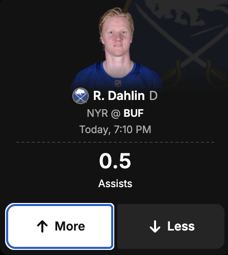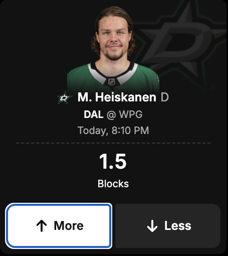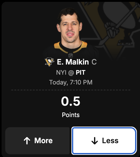 Create a Pick Set by choosing 2+ players from the same sport and Pick Group (a set of picks available from a group of set competitions). For each player, simply select if you think they’ll have more or less than their listed stat projection. In each Pick Set, you can not pick the same player twice and you must pick players from at least two different teams.