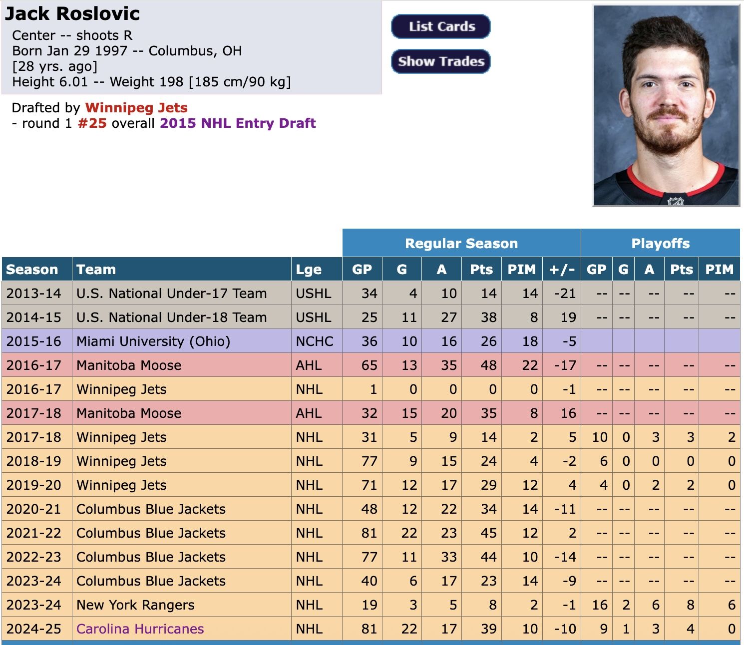 1. Roslovic has been a solid even strength scorer for a few years now. Last season, 2024-25, he put up 2.1 points per 60 minutes,